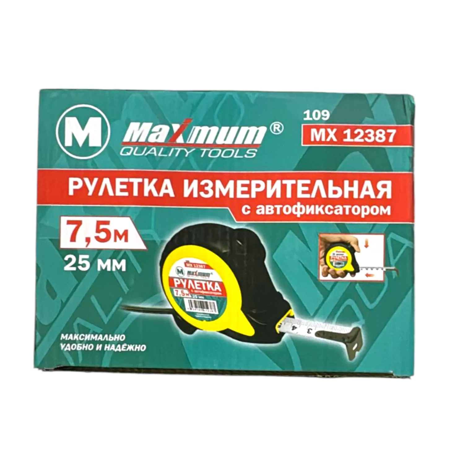 Рулетка измерительная 7,5 м*25 мм от "MAXIMUM" из ударопрочного АБС-пластика имеет обрезиненное нескользящее покрытие. Автофиксатор и зажимная клавиша делают работу удобной и быстрой.
