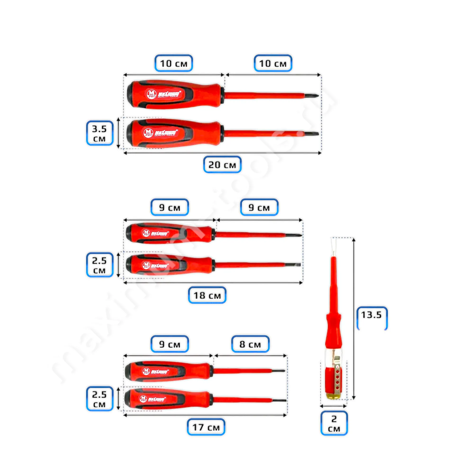 Набор диэлектрических отверток от "MAXIMUM" имеет все популярные размеры PH и SL и пробник напряжения в комплекте.