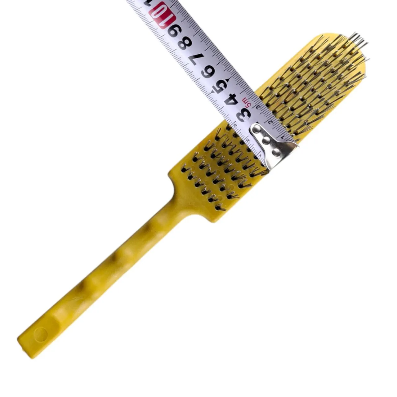 Ручная щетка с шестью рядами жёсткого металлического ворса — незаменимый инструмент для интенсивной очистки и обработки поверхностей. Она изготовлена из прочной стальной проволоки и ударопрочного пластика. Эргономичная ручка с отверстием для подвешивания обеспечивает удобный хват и компактное хранение. Общая длина щётки — 270 мм, длина жёсткого стального ворса — 25 мм.