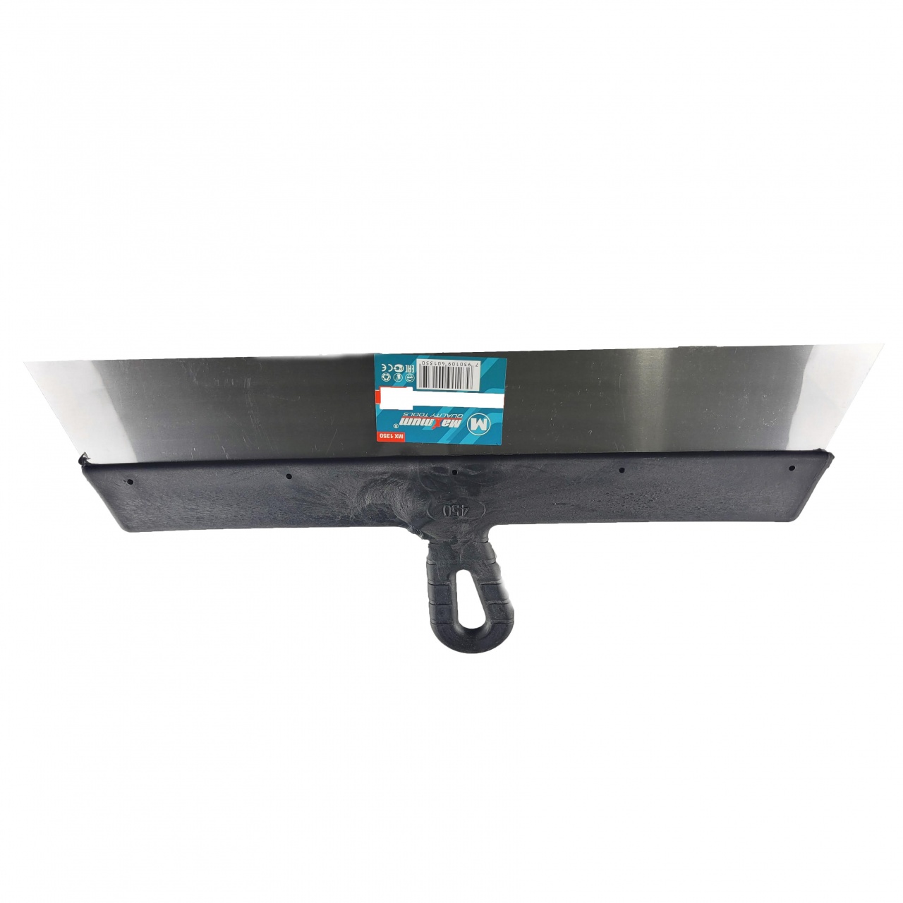 Шпатель для шпаклевки от Maximum Quality Tools 450 мм предназначен для выравнивания по поверхности шпаклевок и других строительных растворов, заделки трещин и швов. Стальное пружинящее полотно предотвращает деформацию лезвия при работе. Прямой угол лезвия позволяет выводить углы в 90 градусов. Эргономичная пластиковая ручка создана для длительной комфортной работы. Большая ширина лезвия позволяет развивать высокую скорость нанесения строительных смесей.