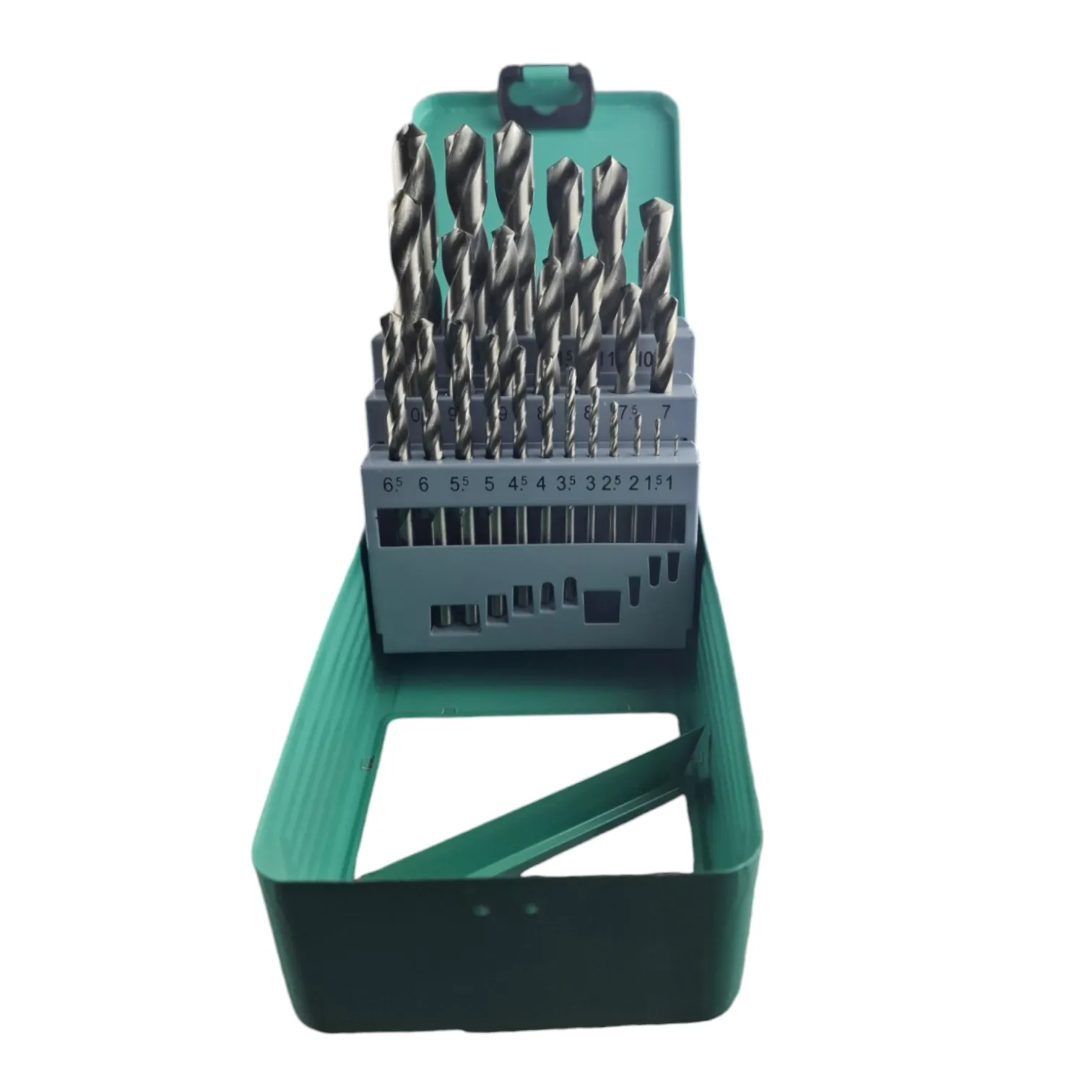 Для удобства хранения и транспортировки набора предусмотрен прочный металлический бокс с подписанными сверлами, который раскрываясь дает возможность выбрать именно то сверло, которое необходимо.